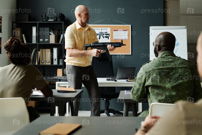 Молодой серьезный лысый мужчина показывает, как стрелять из пулемета