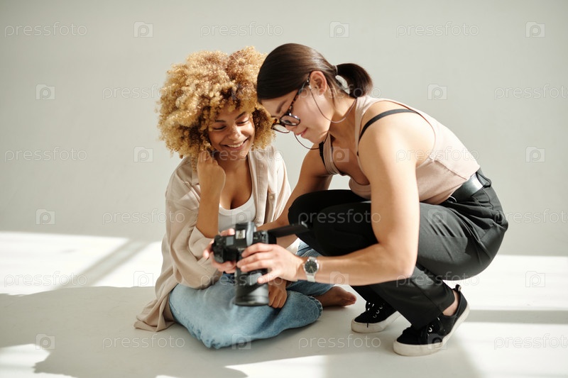 Счастливая молодая модель и фотограф, смотрящая на новые снимки