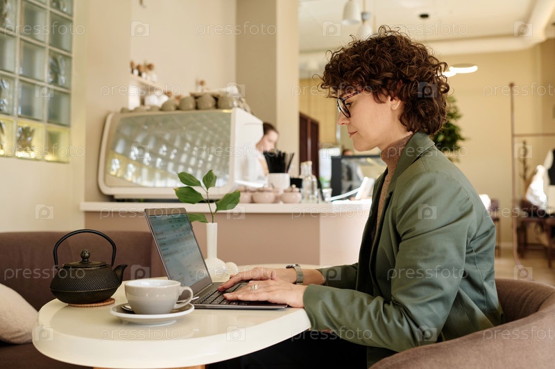 Деловая леди работает на портативном компьютере в кафе