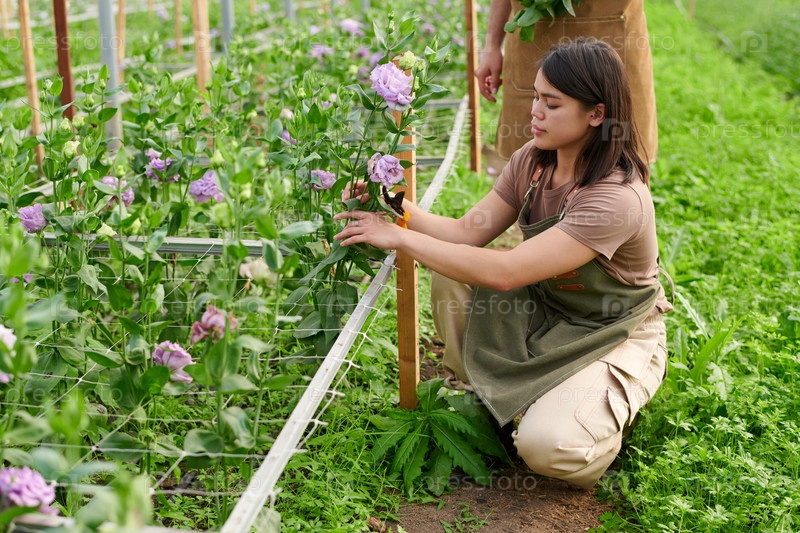 Молодая фермерка или цветочник, заботящийся о фиолетовых цветах эустомы