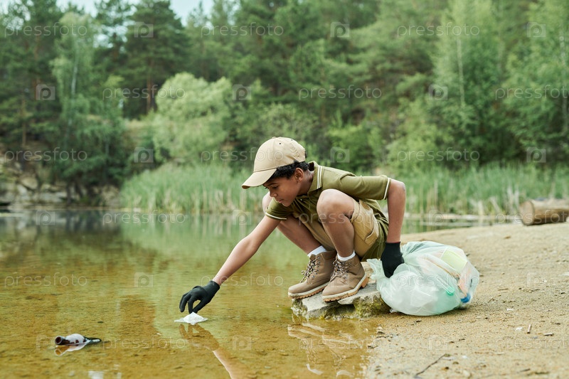 Мальчик очищает воду от мусора
