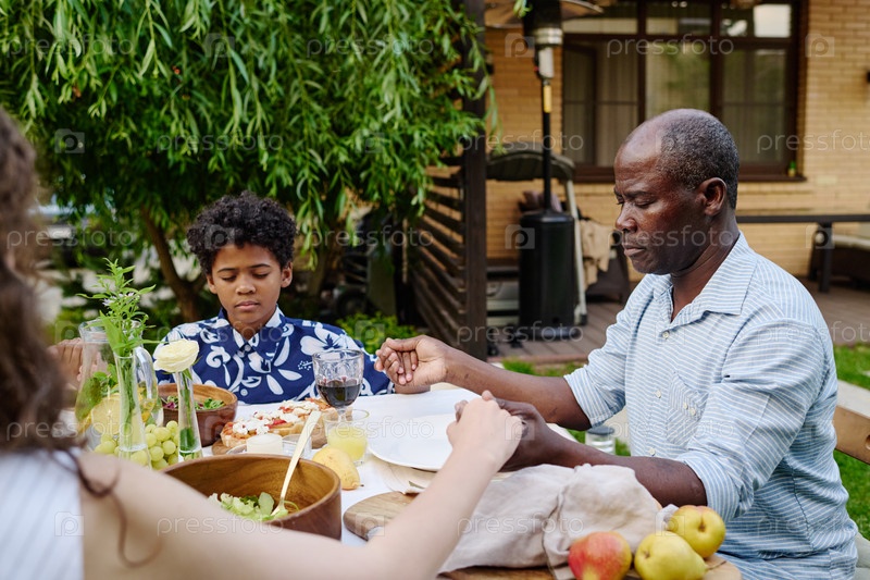 Афроамериканский мужчина и его внук с закрытыми глазами держатся за руки