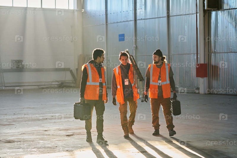 Три молодых инженера-мужчины из склада, несущие ящики с инструментами и лестницу