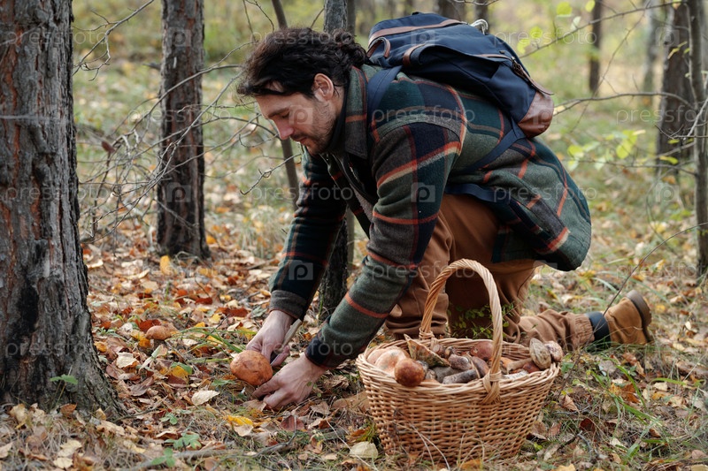 Боковый вид молодого самца, собирающего грибы и режущего апельсиновую шапочку boletus
