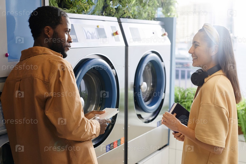 Счастливая молодая женщина в повседневной одежде смотрит на афроамериканского парня