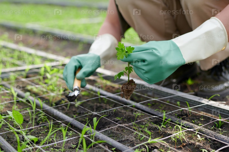 Близкий план рук в резиновых перчатках фермера или садовника с рассадой