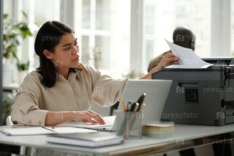 Загруженная молодая женщина-бухгалтерка принимает напечатанные документы в ксерокопирующую машину