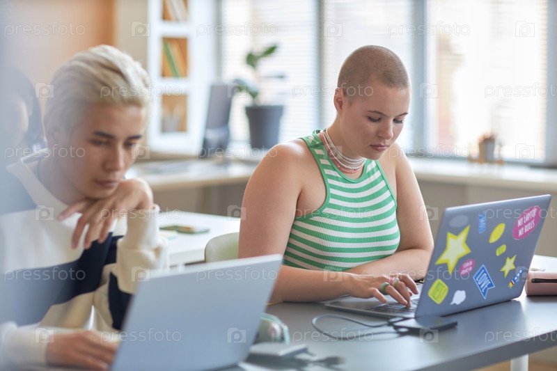 Молодая серьёзная студентка печатает на клавиатуре ноутбука, сидя у стола