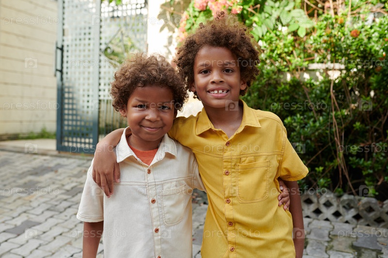 Обнимающие братья, стоящие на заднем дворе