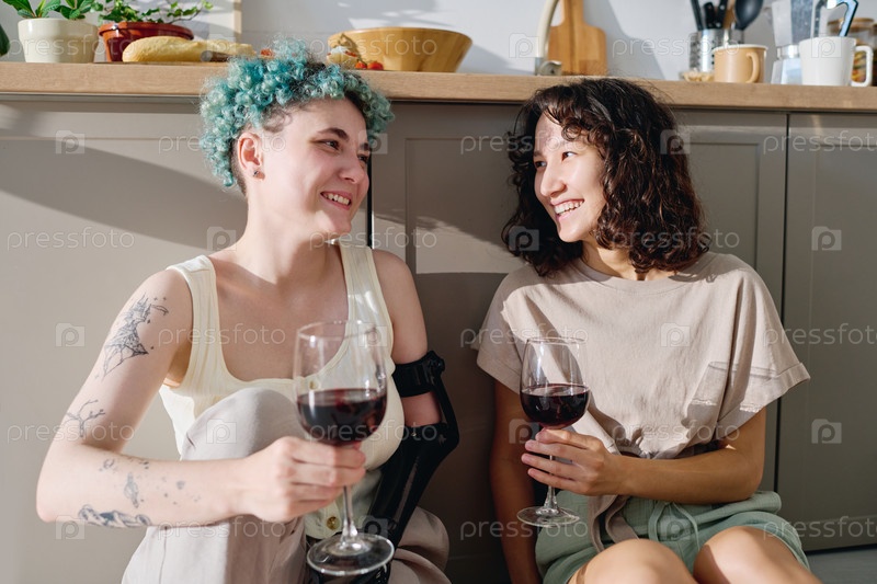 Молодая жизнерадостная женщина с инвалидностью и ее девушка, приносящие тост за красное вино