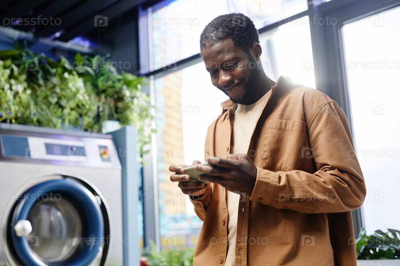 Молодой улыбающийся мужчина в повседневной одежде смотрит любопытное видео на смартфоне