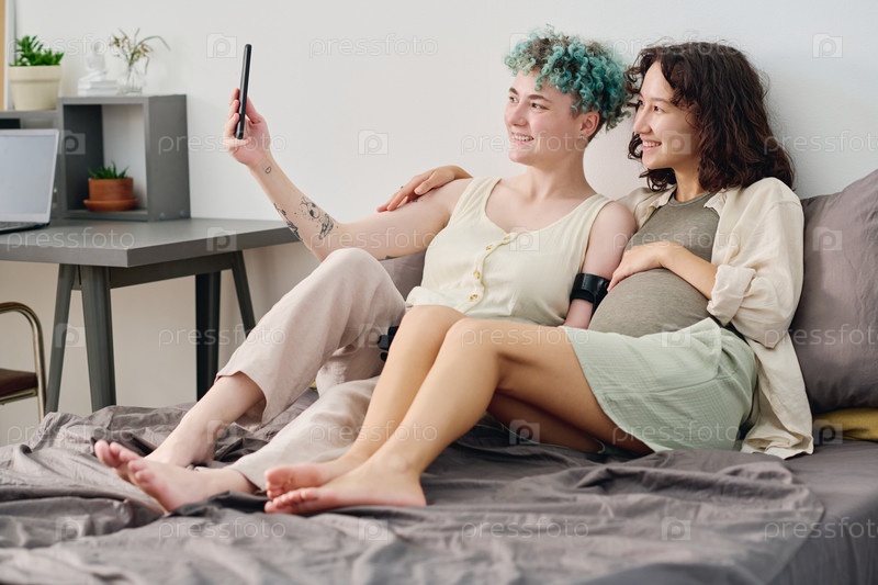 Две счастливые молодые подруги смотрят на экран смартфона, делая селфи