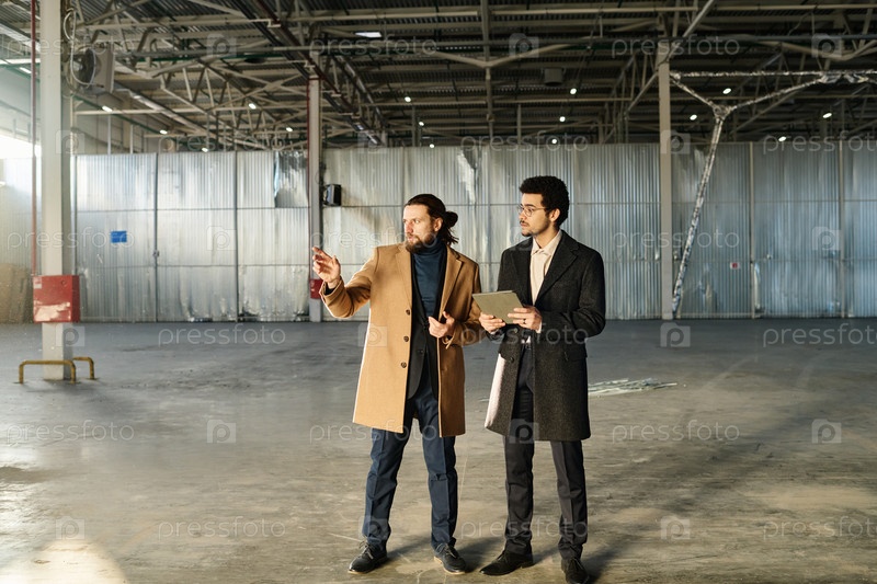Длинный снимок двух молодых предпринимателей, осматривающих территорию для нового офиса