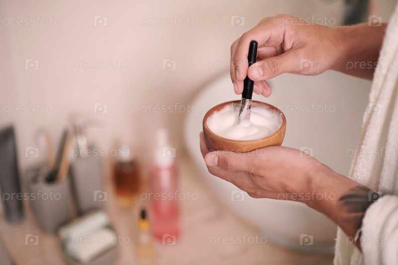 Руки молодого человека смешивают пену с кистью в маленькой деревянной чашке