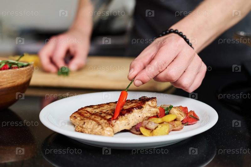 Человек кладет чили-пепер на стейк