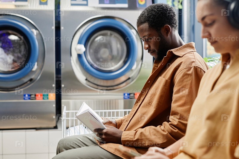 Серьезный афроамериканский мужчина читает книгу рядом с молодой женщиной