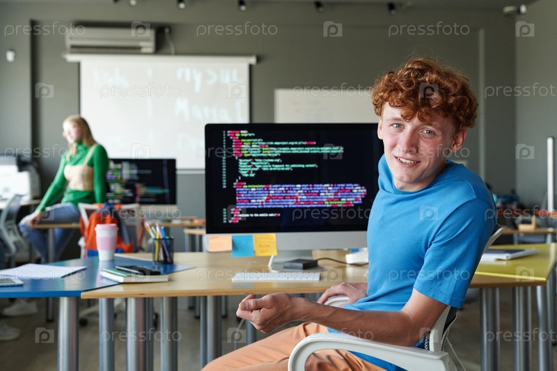 Школьник, работающий с компьютерными кодами на компьютере
