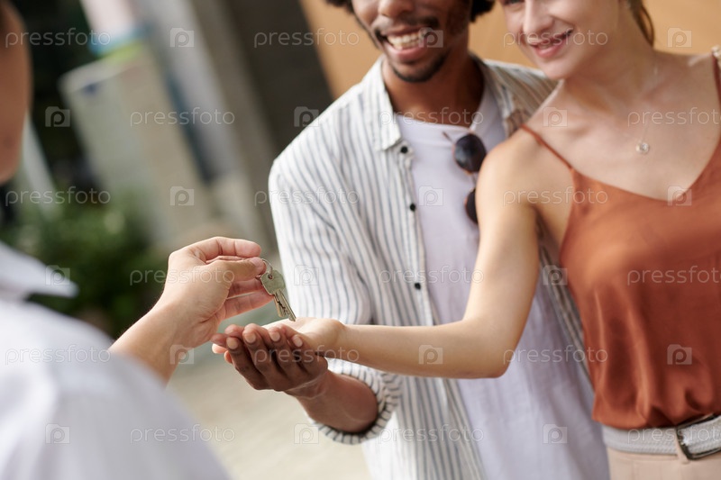 Агент по недвижимости, отдающий ключи клиентам