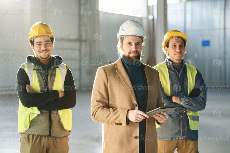 Счастливый молодой бригадир в бежевом пальто и два инженера