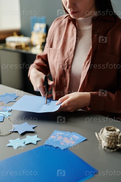 Молодая женщина вырезает звезды Давида из синих листов бумаги