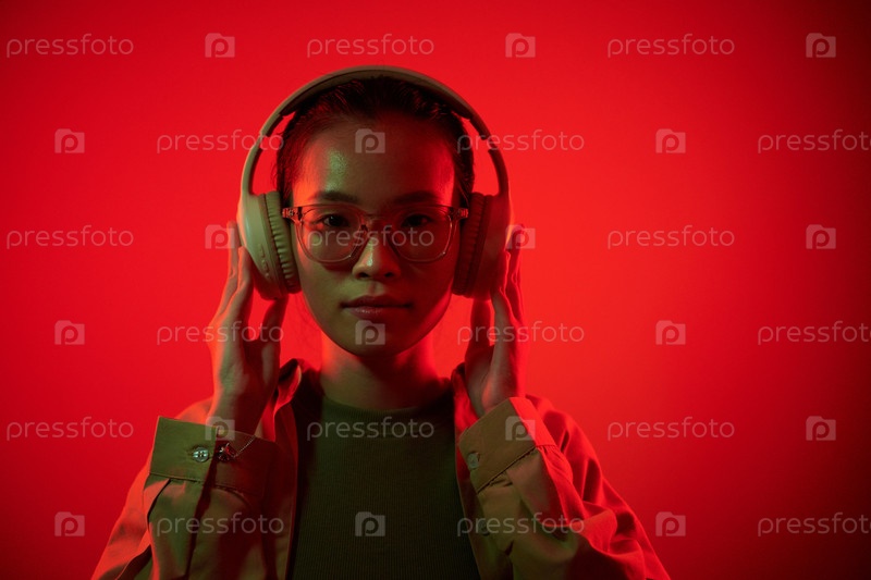 Молодая азиатская женщина, носящая наушники