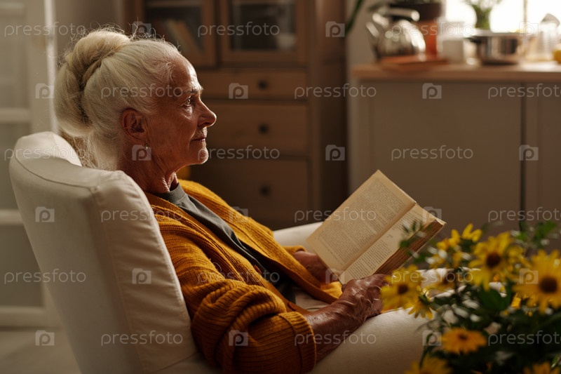 Серьезная бабушка с открытой книгой ждет кого-то, сидя в кресле
