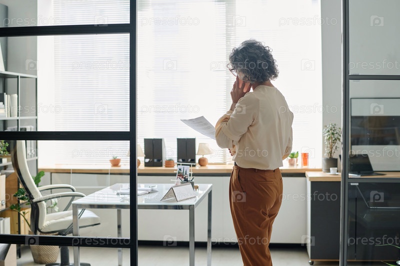 Задний вид зрелой седой женщины-главного исполнительного директора с мобильным телефоном