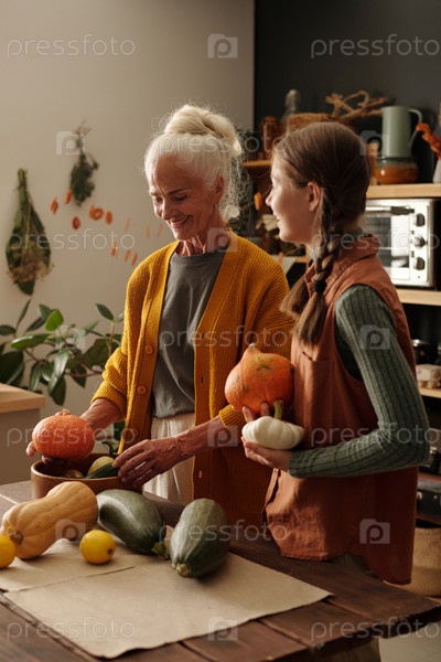 Пожилая женщина с белыми волосами и ее внучка, стоящая за столом