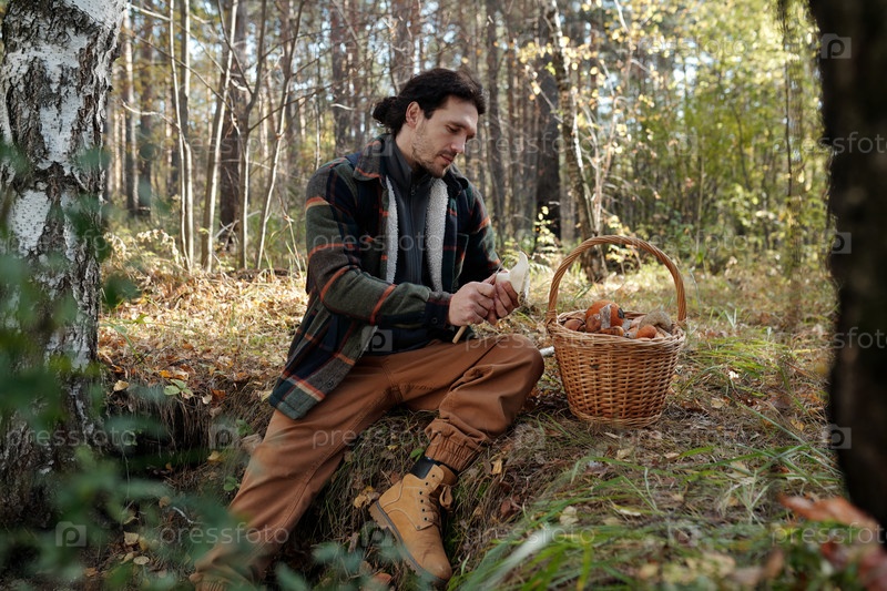 Молодой человек режет низкую часть молочного гриба в лесу