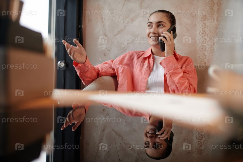 Молодая улыбающаяся женщина в коралловой рубашке и белом футболке разговаривает со своим смартфоном