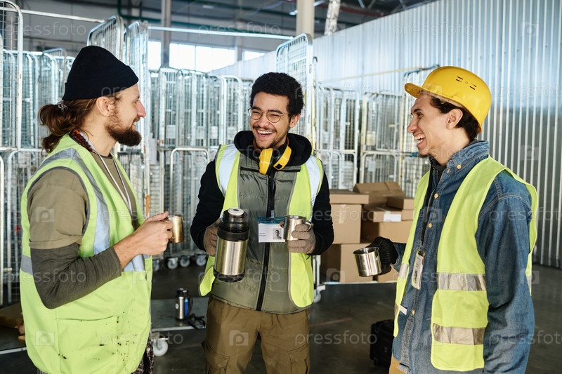 Три молодых веселых инженера в рабочей одежде смотрят друг на друга во время чата