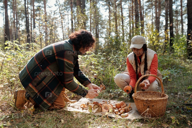 Молодой межкультурный муж и жена проверяют собранные грибы