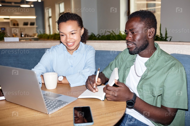 Пара коллег работают над ноутбуком в кафе