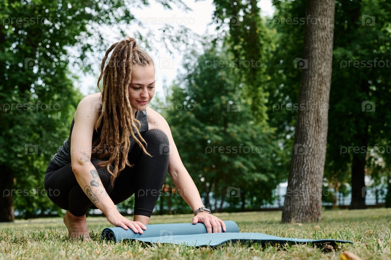 Женщина готовит тренажерный коврик для тренировок