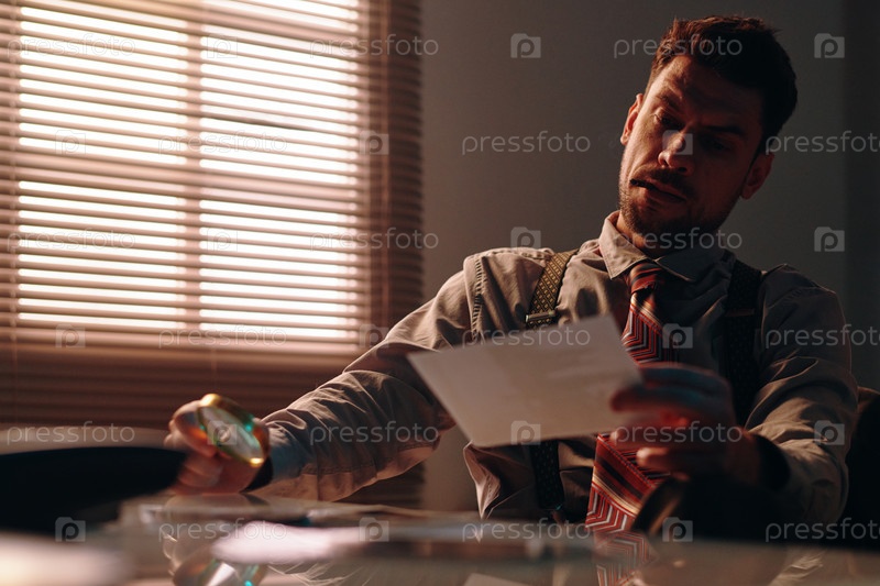 Сосредоточьтесь на молодом человеке, который сидит за столом перед камерой и смотрит на фотографию