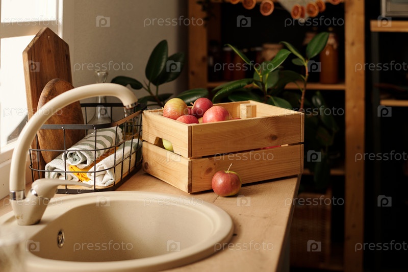 Бежевый металлический кран и раковина на кухонном столе с деревянной коробкой со спелыми яблоками