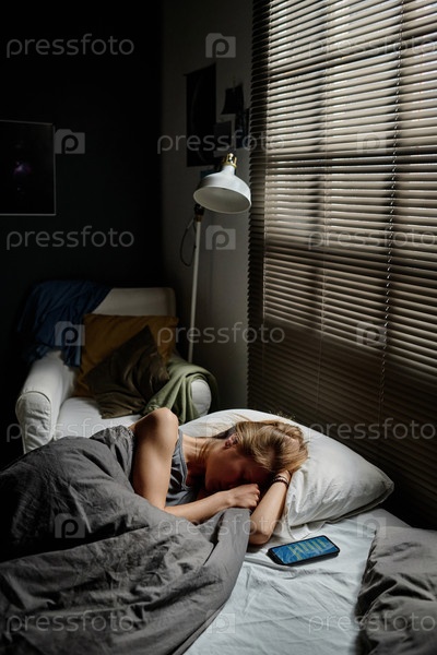 Расстроенная девочка-подросток, страдающая от киберзапугивания, лежала на кровати и плакала