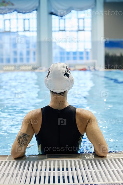 Задний вид молодой спортсменки в черном купальном костюме и белой плавательной шляпе