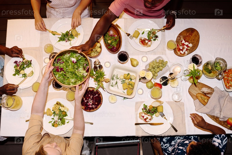 Вид сверху молодого афроамериканца, берущего деревянную миску со салатом