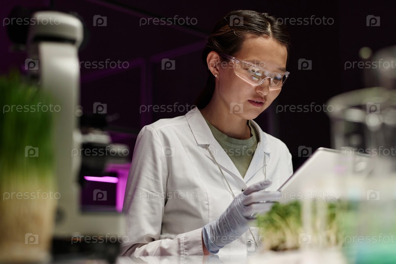 Молодой ученый проверяет цифровой планшет во время работы