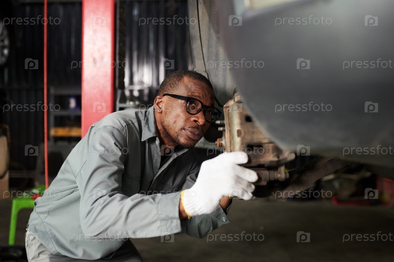 Механик осматривает подвешенный автомобиль