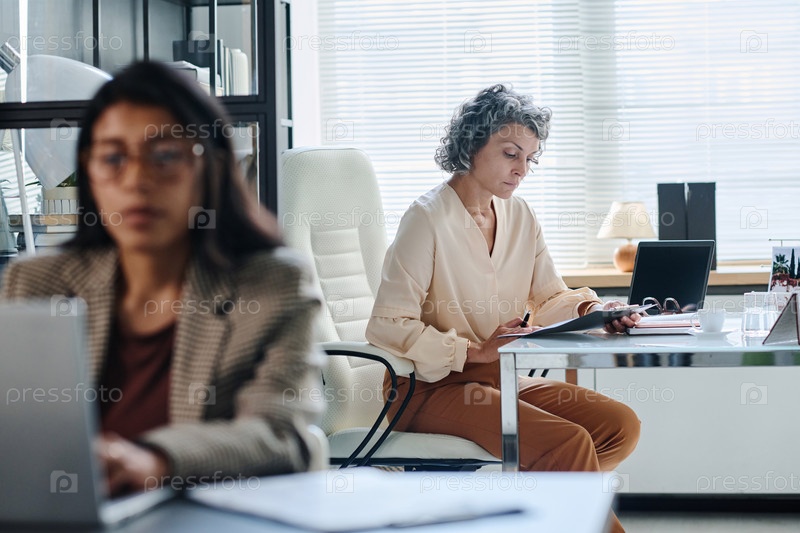 Серьезный зрелый директор компании, читающий деловые документы