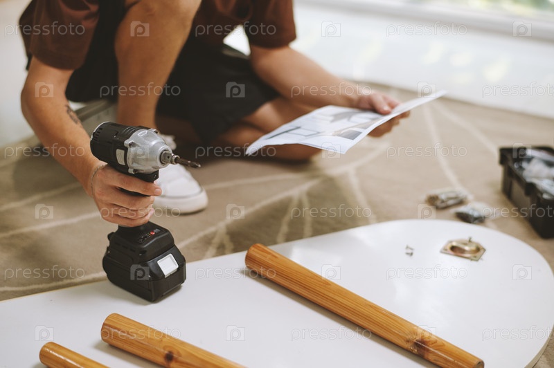 Молодой человек, использующий силовую сверлку при монтаже кофейного стола