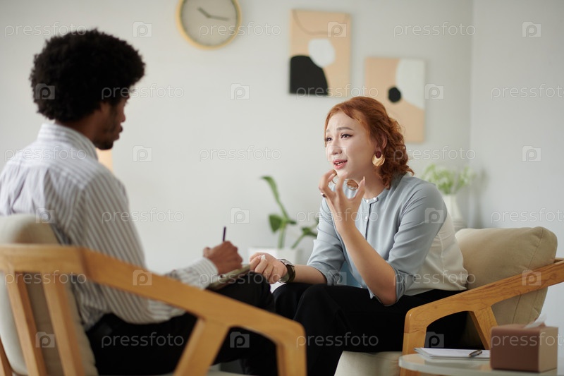 Женщина в состоянии истерии разговаривает с психотерапевтом о своем травмирующем переживании