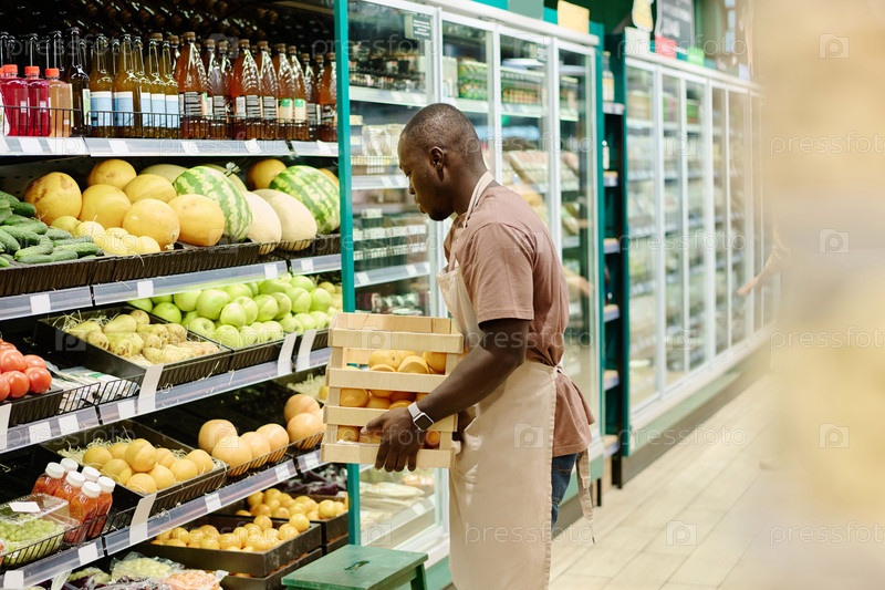 Работница супермаркета, несущая свежие фрукты