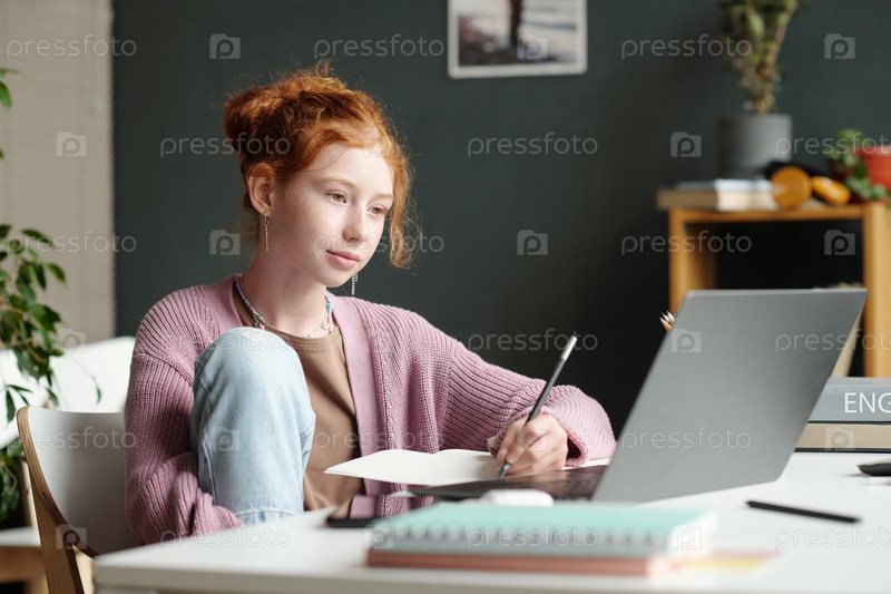 Красивая школьница с карандашом, которая делает заметки и смотрит на экран ноутбука