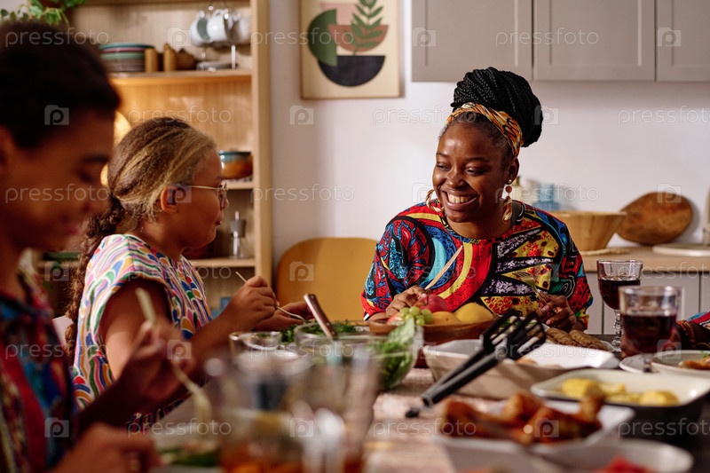 Веселая молодая женщина в экзотических нарядах сидит рядом с праздничным столом