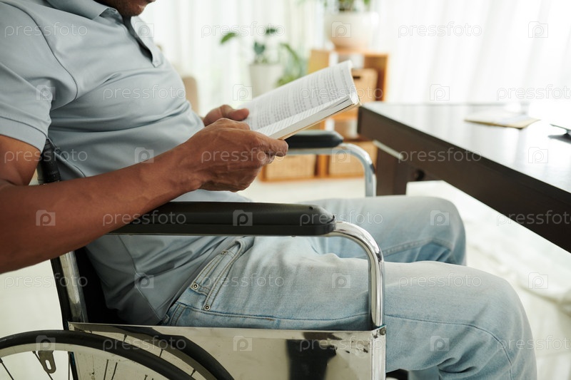 Обрезанное изображение мужчины, сидящего дома в инвалидной коляске и читающего книгу