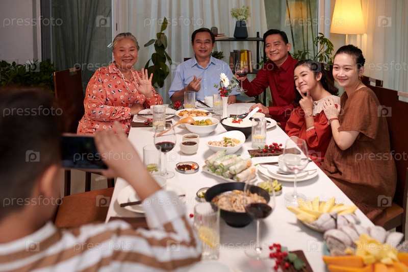 Мальчик фотографирует семью за обеденным столом