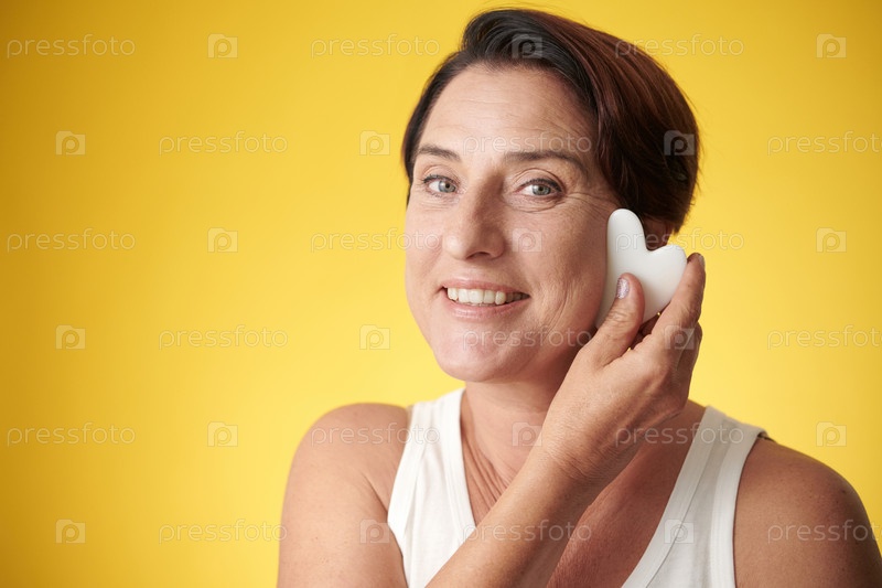 Женщина, делающая массаж с помощью инструмента Gua Sha
